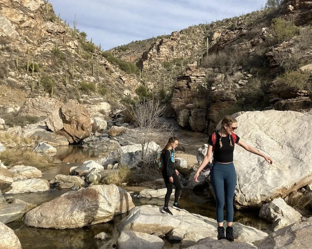 Hikers hop across pools of water in a desert canyon.