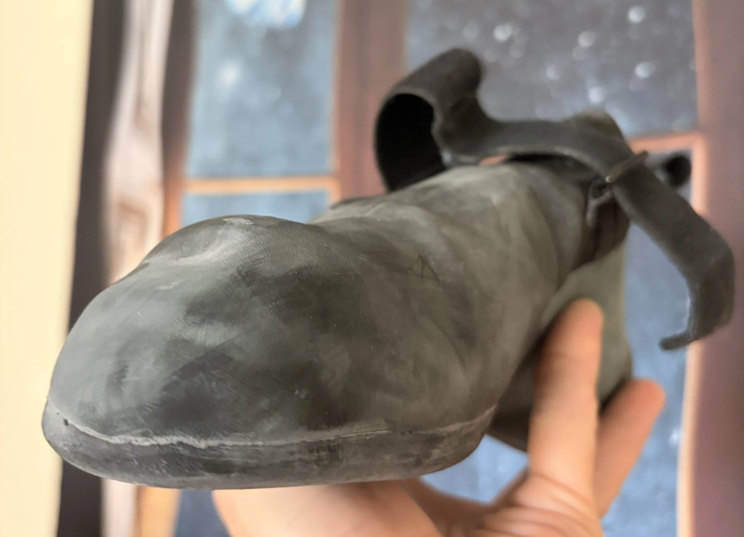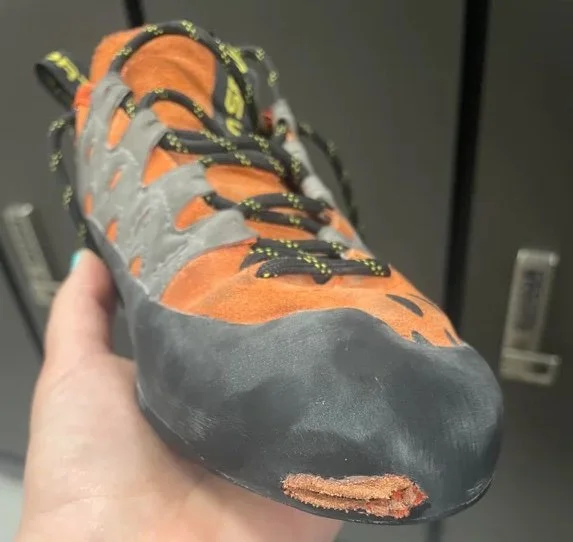 At this point, you’re no longer standing on proper toe rubber — you’re mashing down on an unholy mishmash of worn sole and rand material.